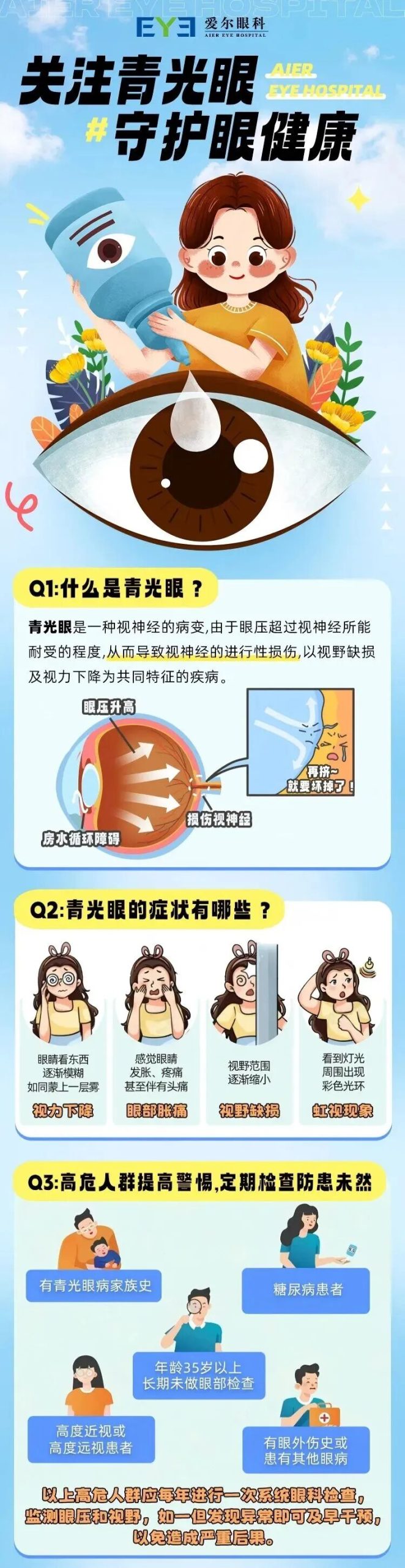 有一种眼病,从不主动发出预警,却在不知不觉中偷走视野、侵蚀光明,它就是被称为“沉默的视力小偷”——青光眼。 作为全球不可逆性致盲眼病,它隐匿性强、损伤不可逆,但万幸的是早发现、早干预、长期管理,青光眼完全可防可控。 2026年3月8日—14日,第19个世界青光眼周如约而至。今年主题为“Uniting for a Glaucoma-Free World(同心守护,无青视界)”。我们正式开启青光眼防控科普预热,以专业守护每一双眼睛,让光明不被“悄悄偷走”。 十九载全球接力:从一日科普到一周守护 青光眼防控,是一场跨越十九年的全球坚守。2008年,世界青光眼联合会(WGA)与世界青光眼患者联合会(WGPA)发起了世界青光眼日;为扩大科普覆盖面、提升全民防控意识,随后升级为世界青光眼周(每年3月第二周)。 图片来源于:世界青光眼周官方网站 从2008到2026,十九载初心不改、十九届接力前行,只为打破认知盲区,让更多人远离青光眼致盲风险。 别让“隐形杀手”毁了光明 据世界卫生组织报告: 青光眼早期几乎无症状,超过半数患者确诊时已至中晚期,视功能损伤无法挽回。这场全民科普,正是为了让 “隐形杀手” 无处藏身。 高危人群请注意!每年必做青光眼筛查 以下人群属于青光眼高危群体,建议每年至少做1次专业眼底+眼压+视野检查: ●高度近视>600度或高度远视 ●有眼外伤史或患有其他眼病 全生命周期的关爱 全生命周期守护,打造无“青”“视界”。 爱尔眼科建立了科学的随访机制、终身眼健康关爱体系,为患者提供全方位生活指导,提升生活质量。 同时,医院还积极成立 “青光眼病友之家”,定期开展教育科普活动和讲座,向患者及其亲属普及青光眼知识,增强自我保健意识,降低患病率和致盲率。我们深知,只有通过全生命周期的关爱,才能确保患者能够长期维持有用视功能,提升生活质量。 同心守护 无青视界 参考文献 1.World Health Organization. World report on vision[R]. Geneva: WHO, 2021. 2.Tham YC, Li X, Wong TY, et al. Global prevalence of glaucoma and projections of glaucoma burden through 2040:a systematic review and meta-analysis[J].Ophthalmology,2014,121(11):2081-2090. doi:10.1016/j.ophtha.2014.05.013. 3.中华医学会眼科学分会青光眼学组.中国青光眼防治指南(2020年版)[J].中华眼科杂志, 2020,56(12): 906-923.